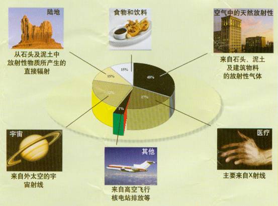 人们受到的放射性照射大约有82%来自天然环境,大约有17%来自医疗诊断,而来自其他活动大约只有1%。